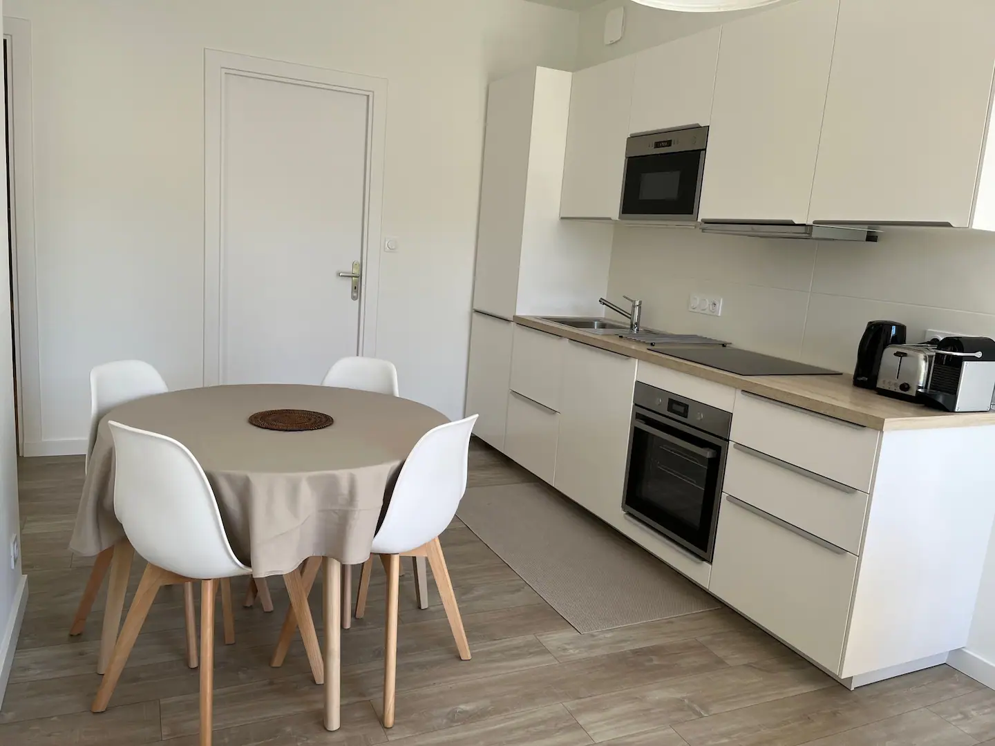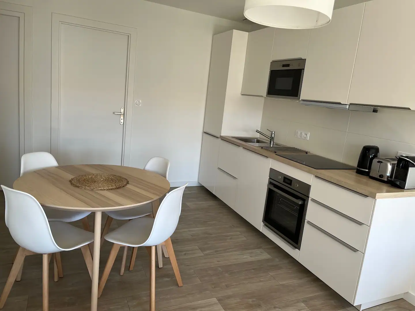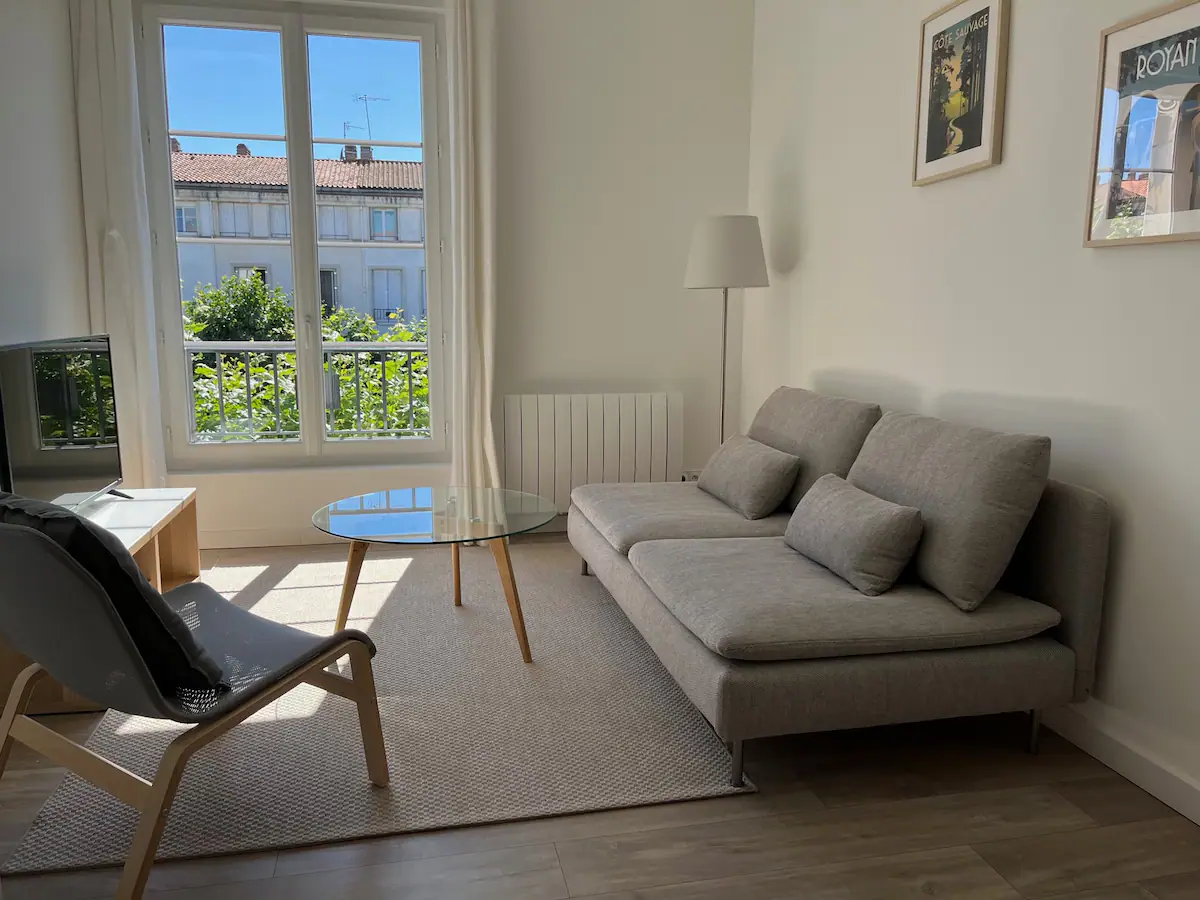 Appartement neuf en centre-ville, proche des commerces et du marché. Comprend un séjour avec téléviseur et wifi, une cuisine équipée avec coin repas, une chambre mezzanine avec lit de 140 x 200, et une salle d’eau avec douche et WC. Local pour vélo, surf, et planche à voile. Idéalement situé, proche de Royan, de l’île d’Oléron, et de La Palmyre.